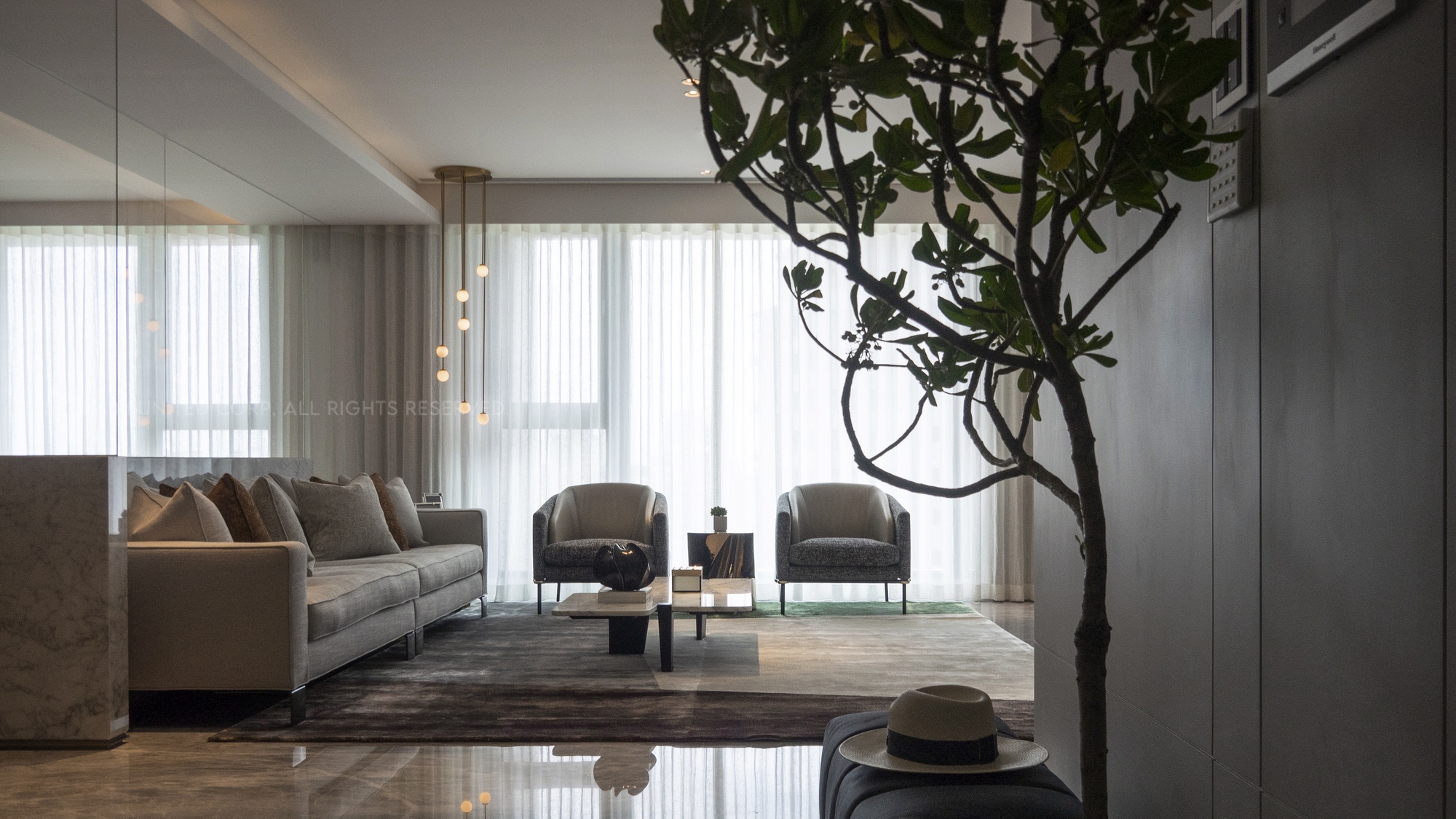 以「藝術、生活、綠意」為設計核心,運用具有自然紋理石材搭配溫潤安定的色彩計畫,暢然通透的動線形塑靜謐空間,為來自新加坡業主在結束繁忙的一天後,打造自在無拘束愜意居所。