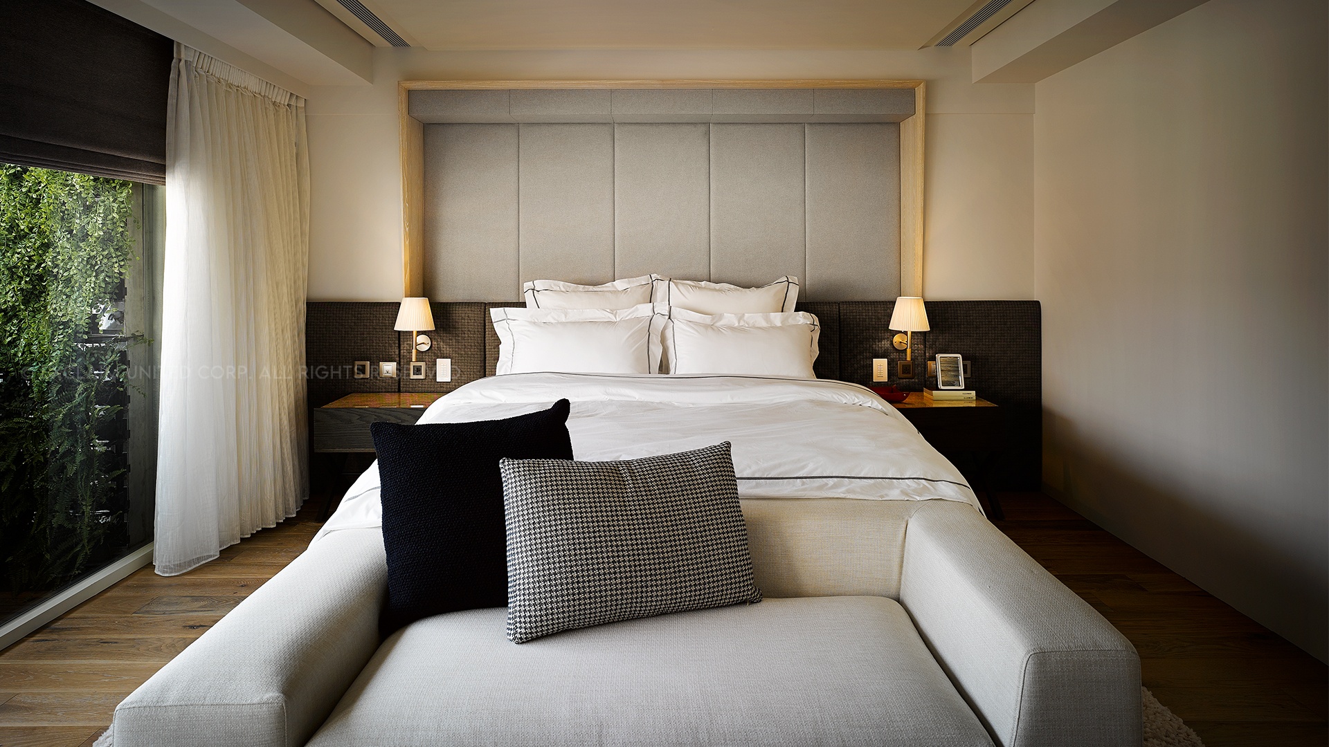 ▲重視度假休閒感的臥室,則以木格柵銜接石材與布料,並以金屬嵌條收邊,