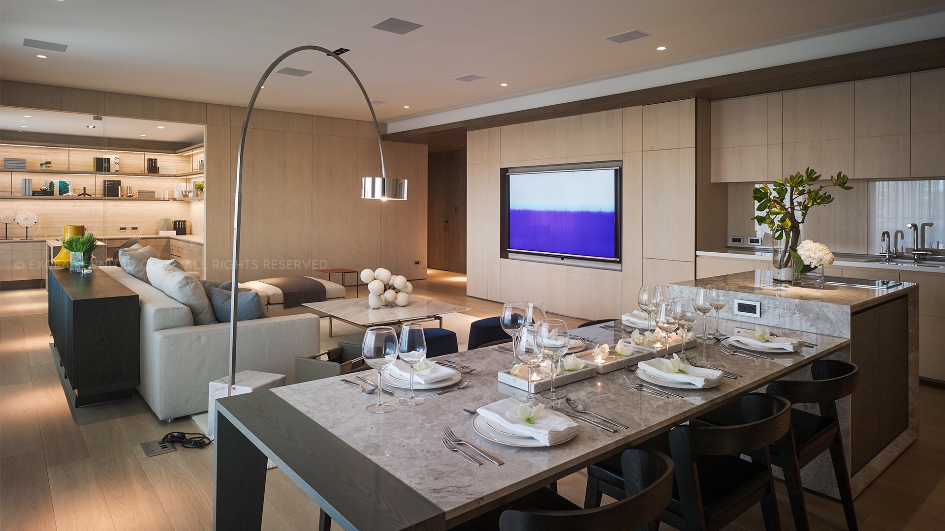 以大理石作為中島檯面十分常見,而設計師則將它延伸與餐桌同為一體,提升了工藝的難度,強化了實用與美感。餐桌的一側則拼接異材質的木質作為單腳收邊,不管是導斜角度的掌控或材質的運用,都在衝突與分割中達成完美比例。