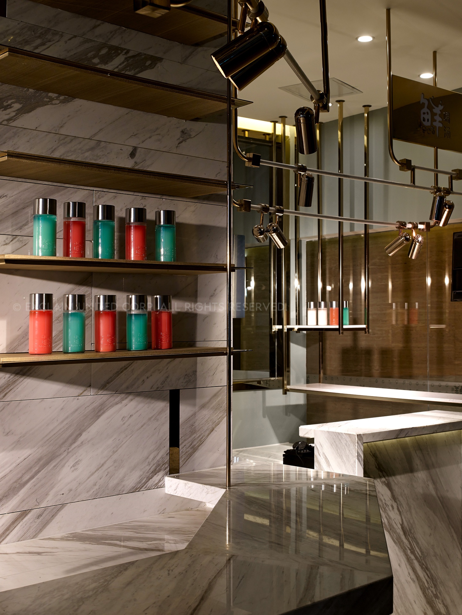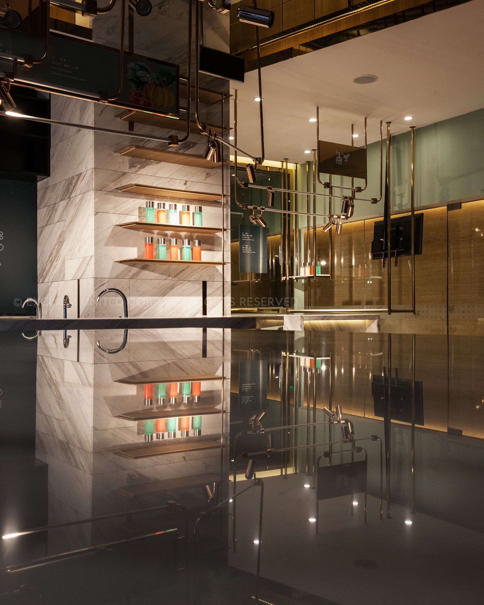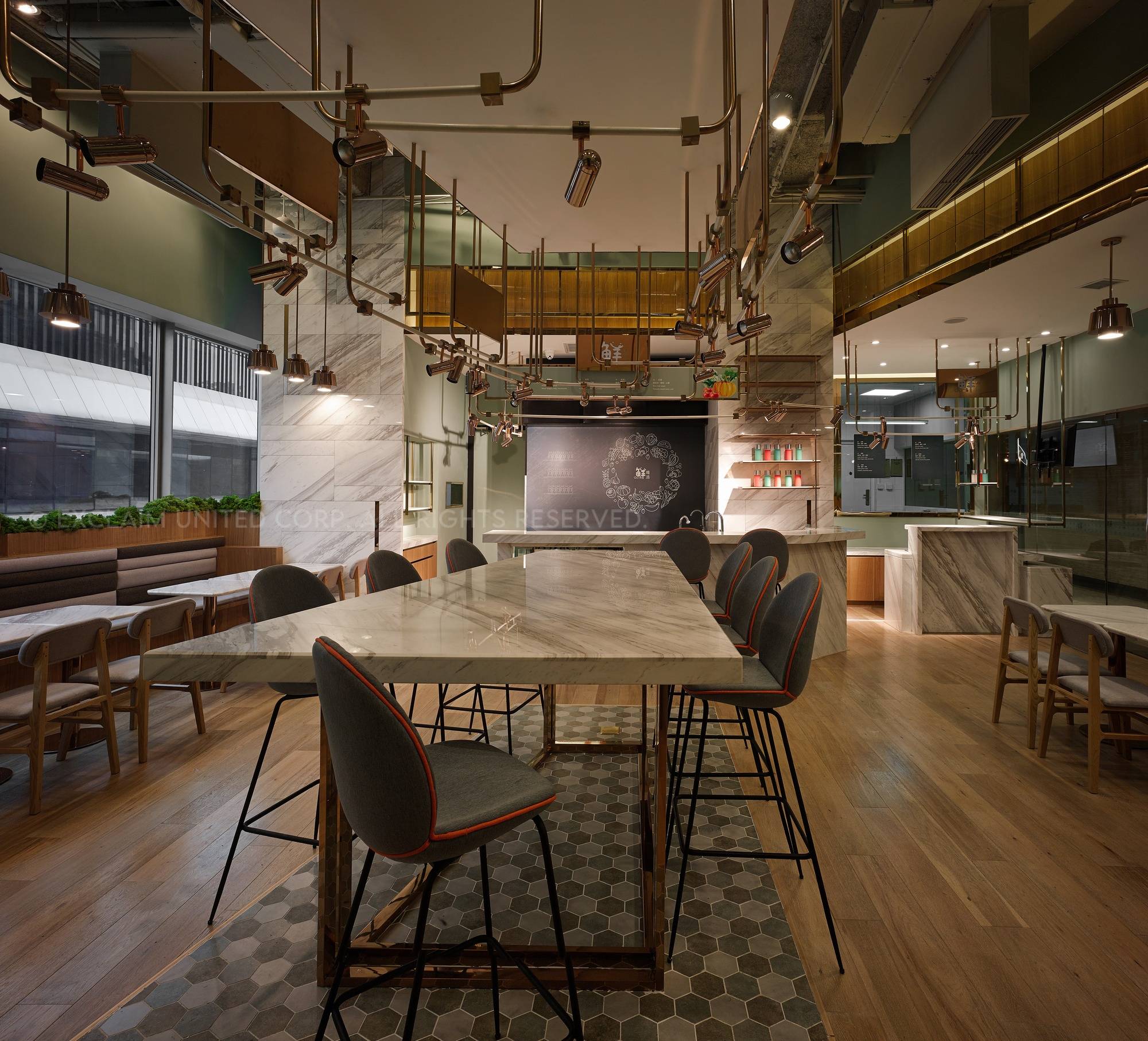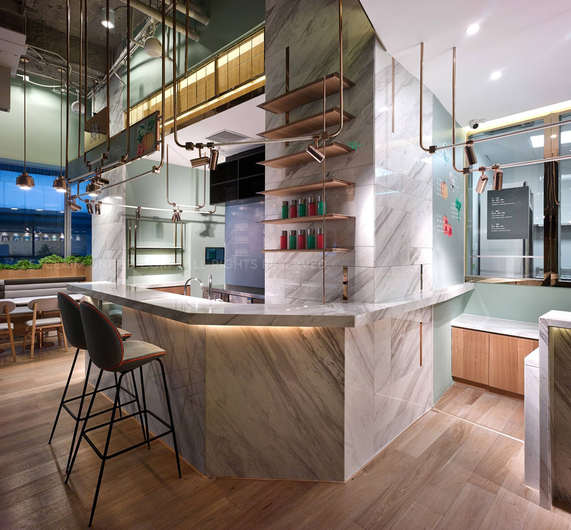 In this space, we used titanium rose-plated mix marble to make lamps, which can display the delicate atmosphere and also present the value of food culture.