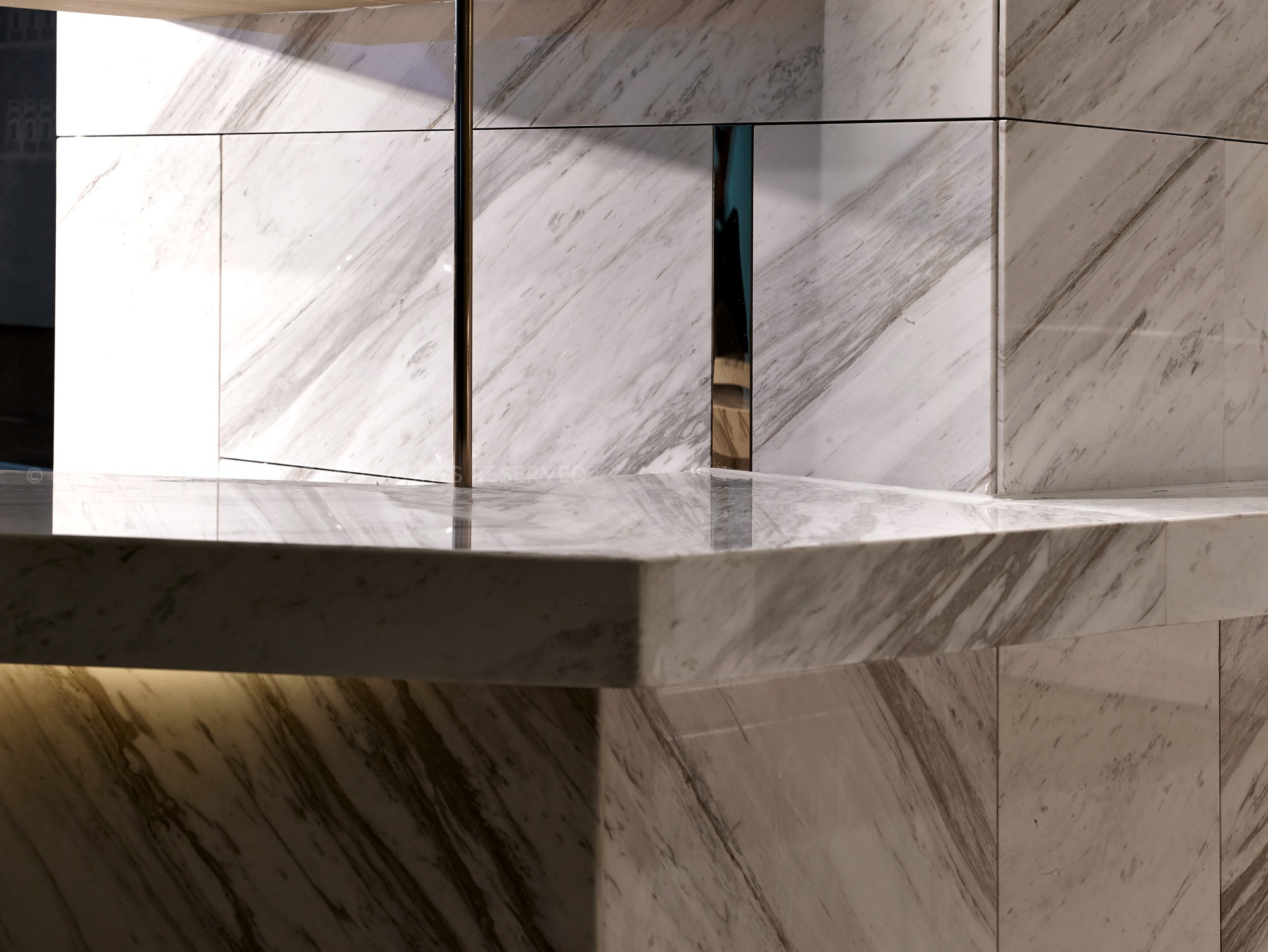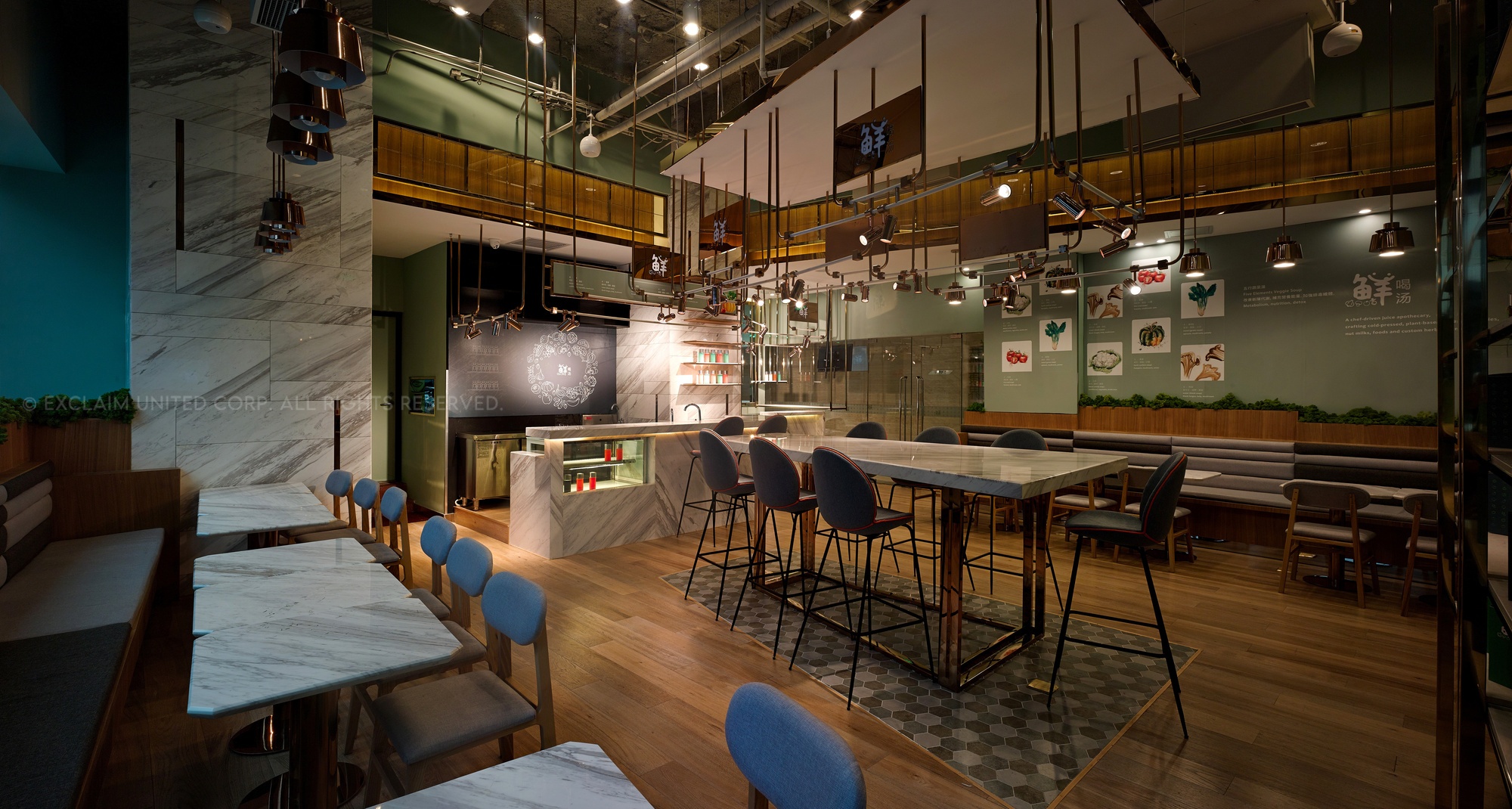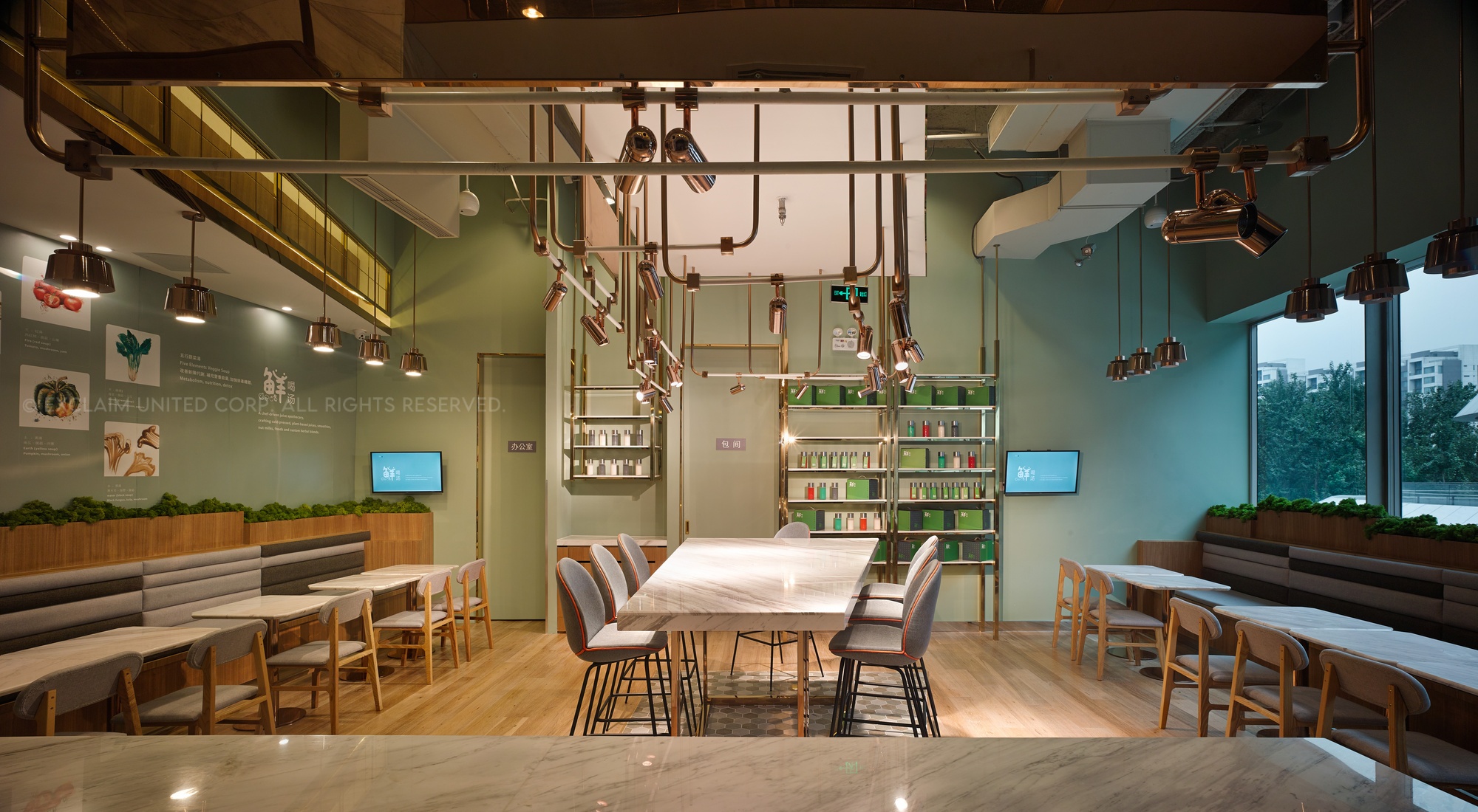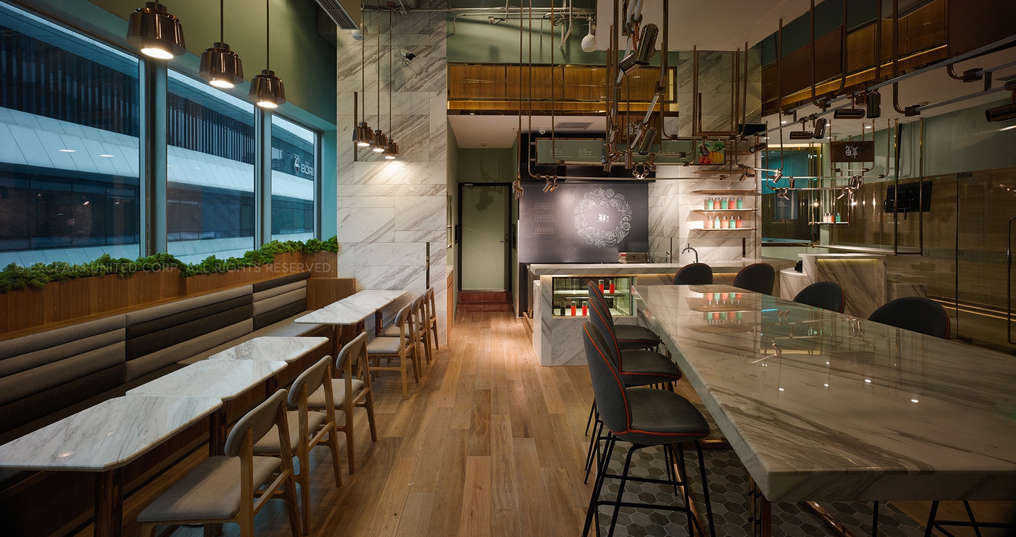 In this space, we used titanium rose-plated mix marble to make lamps, which can display the delicate atmosphere and also present the value of food culture.