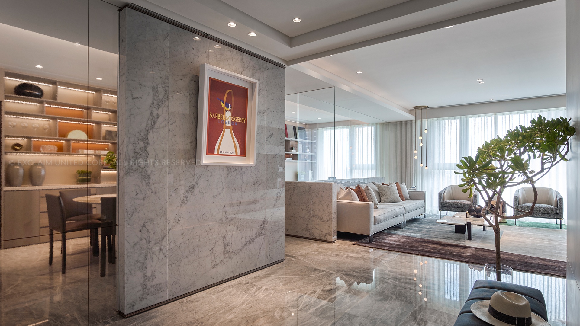 温潤玉質感灰色石材地坪完整公領域之間,白色大理石與清透玻璃以虛實融合設計手法打破空間隔閡,賦予客廳、餐廳及書房各自獨立的空間輪廓,且讓陽光透過寬幅齊屋的落地窗不受格局限制灑落於室內之間。