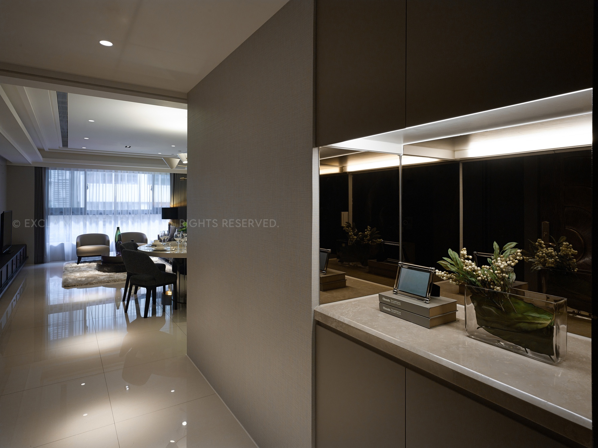 針對金融業菁英、事業有成的屋主,締造優越且品味的生活態度,將設計只軸定位在「簡約與時尚」、「內斂而雅緻」的設計調性,並發揮空間潛能,利用敞朗尺度與俐落的線面關係,形塑別具風格的時尚宅邸,並表現在公共場域的主牆與線面之上,演繹現代人對生活質素、時尚品味的嚮往。