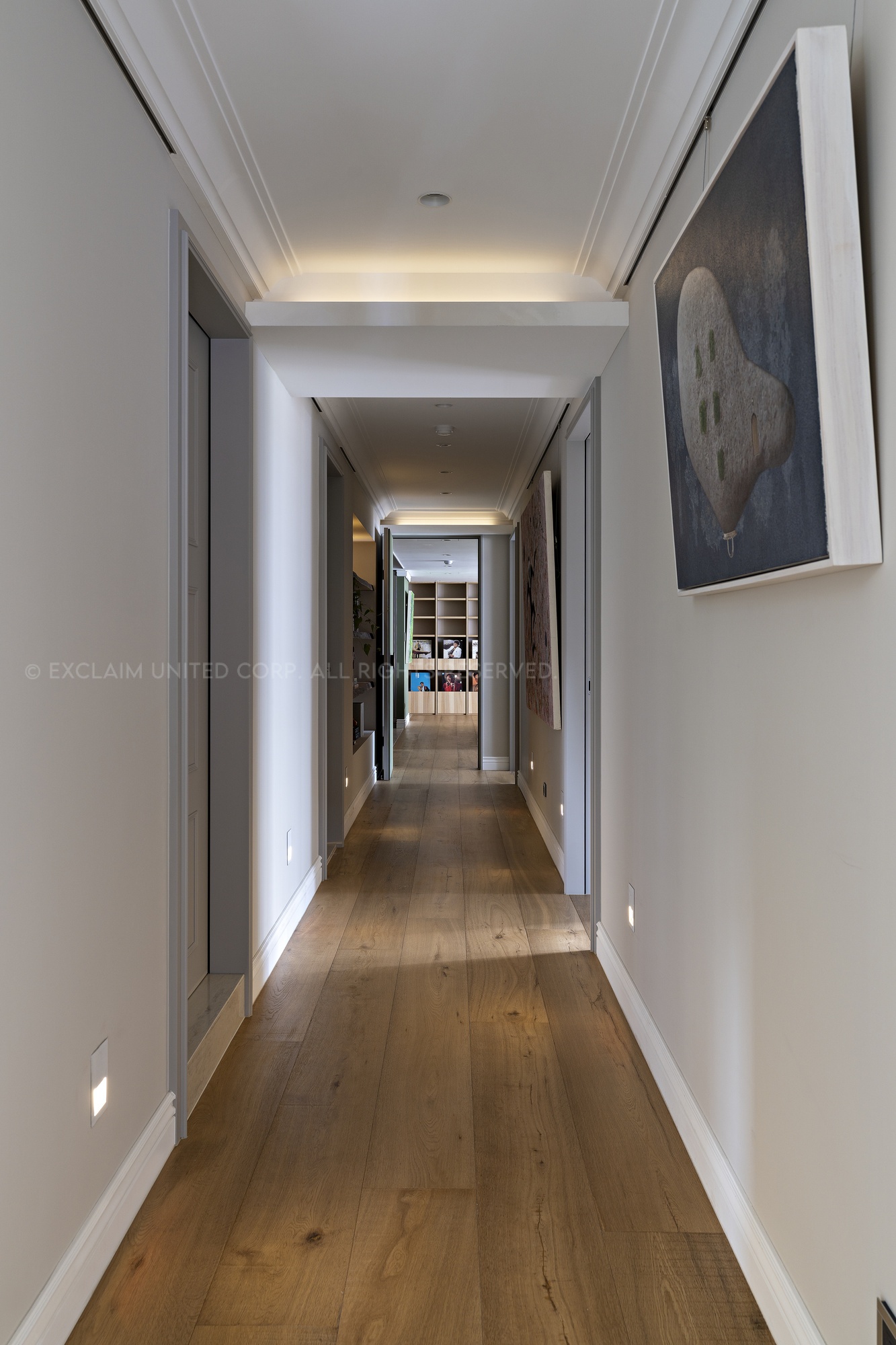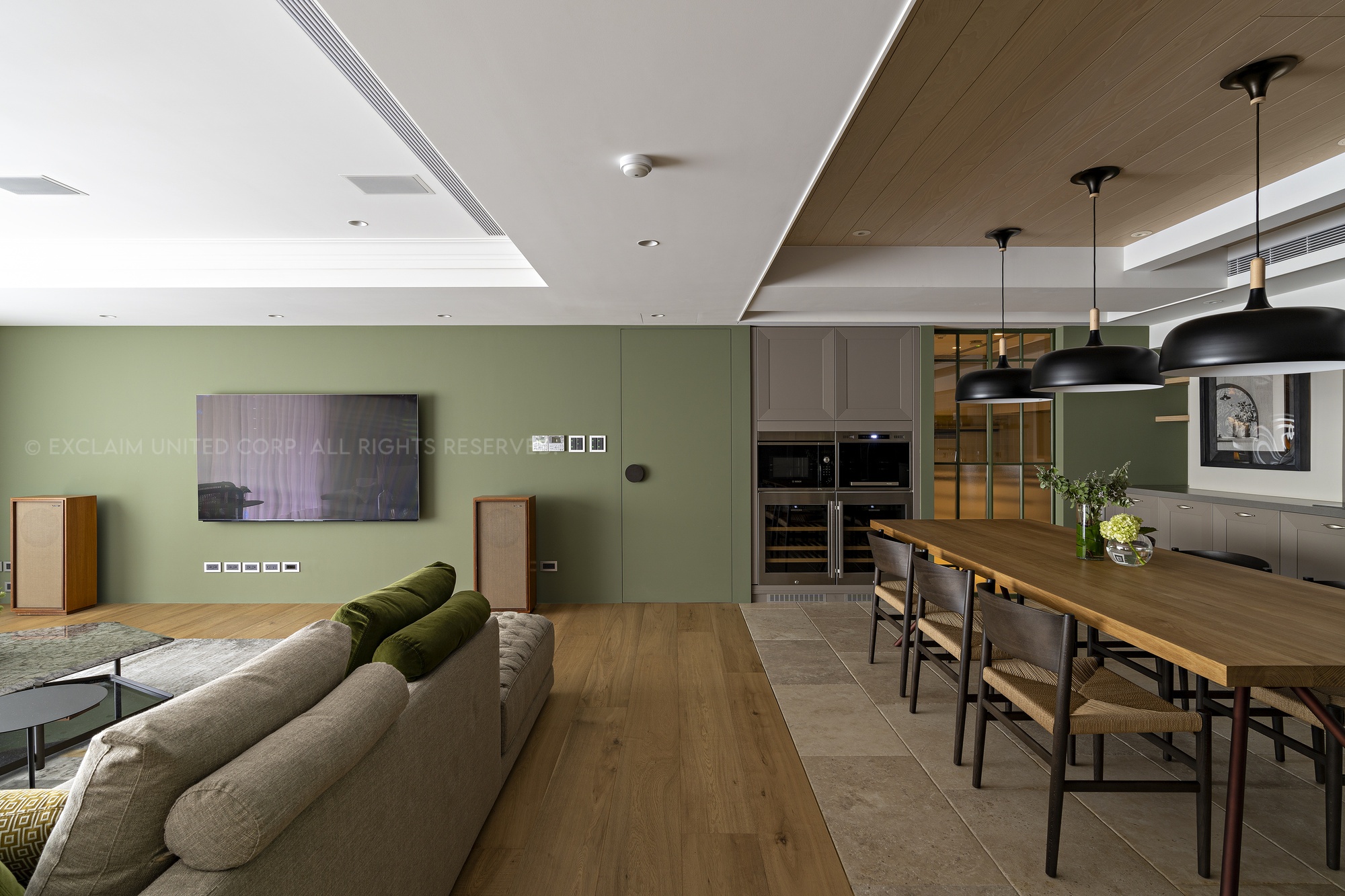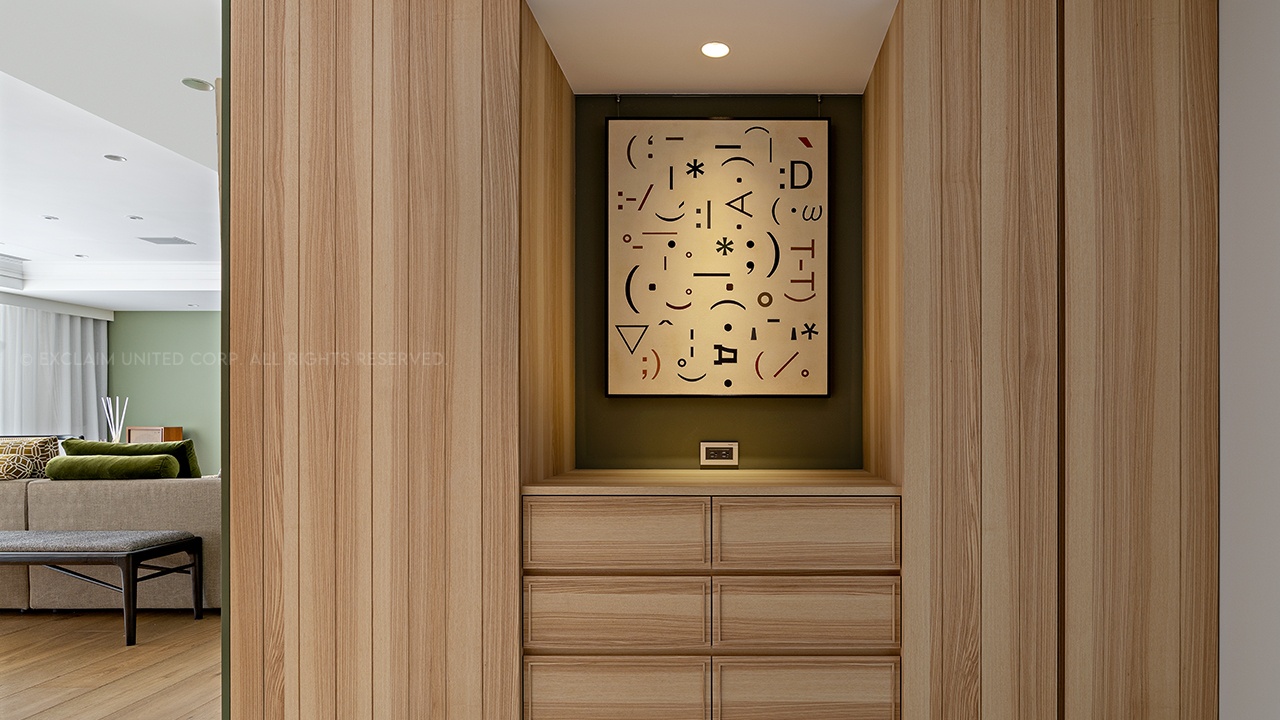 一進入空間中,玄關義大利水磨石地坪烘托人文氣息,而手工訂製玄關櫃保留藝術牆面掛畫塑造端景平台。旋入廳區,電視牆、軟件、空間細節以橄欖綠為底蘊,搭配使用天然橄欖木皮的櫃體與地坪,營造出自然、溫暖的斯德哥爾摩居家氛圍;男主人喜愛的黑膠唱片收納在書房旁特製的展示牆上,矗立於電視旁的老件音箱則勾勒懷舊氣息。 步入餐區,因應亞洲人的烹飪習慣,開放式的西廚區與中式熱炒區以一扇訂製拉門界定不讓油煙四溢,而輕食區自然不修邊仿進口歐式古磚地坪、料理牆面義大利立體鐵道磚、二米七的實木餐桌、原木藤編餐椅流露南法露天咖啡的閒適氛圍,在公區不同場域我們仿若享受從北歐到南歐的文化洗禮。而當推開串連公私場域的暗門,一道藝術長廊貫串主臥與三間小孩房,其間融入屋主的藝術收藏,遊走於其中身心靈都獲得滋養。