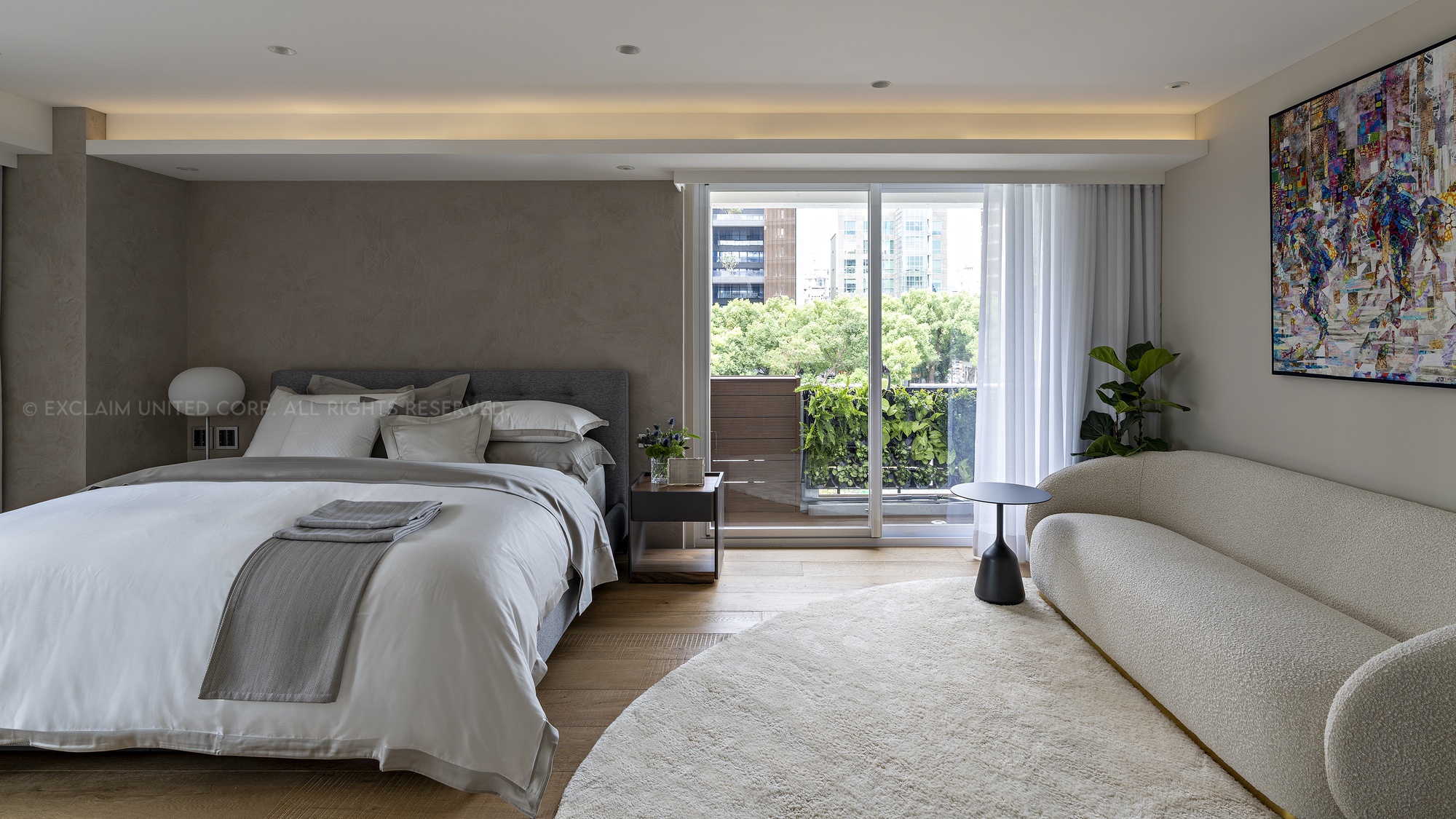 主臥室以手工藝術漆延伸公區人文藝術調性,並運用杏色圓弧型地毯及義大利進口家具營造自然悠閒的居家感,亦隱形區分起居空間及步入式衣帽區。主人衛浴則以圓潤的設計語彙貫穿,圓弧金屬掛鏡、義大利球型壁燈同步舞出輕快的圓舞曲,而崗石檯面設置雙水槽則於精緻設計中展現實用機能。 小孩房皆運用義大利進口木皮圍塑溫潤舒適的寢臥氛圍,並依三個孩子的喜好揮灑色彩,大男孩房透過深藍色作為主牆視覺,營造遼闊大海意象;小男孩房則以藍綠、米白的跳色牆面躍出活潑個性;女孩房橄欖綠床頭背牆呼應戶外敦南綠蔭景緻,創造無限開闊的綠意視野。