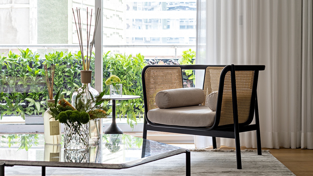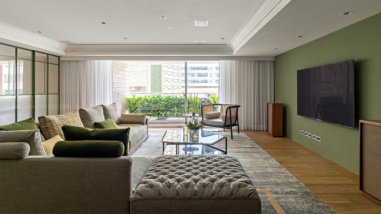 擁有絕佳地理位置的基地為了確保日後生活的安全,周彥如設計總監謹慎地針對建築物結構與管線重新檢核補強,並在每個管道位置預留檢修門,方便日後檢視修繕。而在空間格局上,則拆除局部牆體,將長軸格局通往私領域的走廊,作爲空間中軸線,並透過一道隱藏暗門界定公、私場域。公共空間以開放式客餐廳與視覺通透的書房勾勒百坪宅邸的大器寬敞,而落地窗邊退回的L型陽台則規劃成一整道自動澆灌植生牆,讓綠意由外漫入室內。
