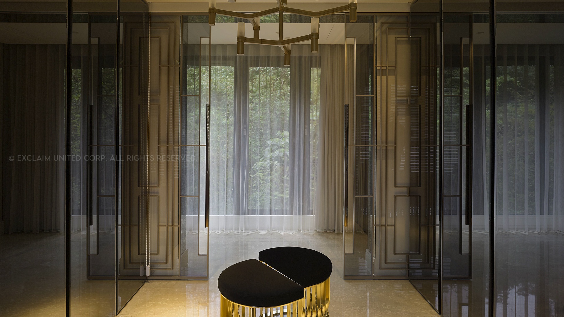 走進雍容的玄關,金屬、石材與玻璃串起冷硬與清透,更擁有極大的隱藏收納量;客廳展示櫃高雅華麗,以仿石紋、隱含金色細點的進口壁紙為底,讓屋主可以精選收藏品展示,又容易整理;餐廚區的軟裝更是因應空間設定不同的組合方案,讓屋主參與選擇及佈置,打造自己想要的氛圍。周總監宛如空間造型師,讓屋主直接拎包入住如飯店般的家。