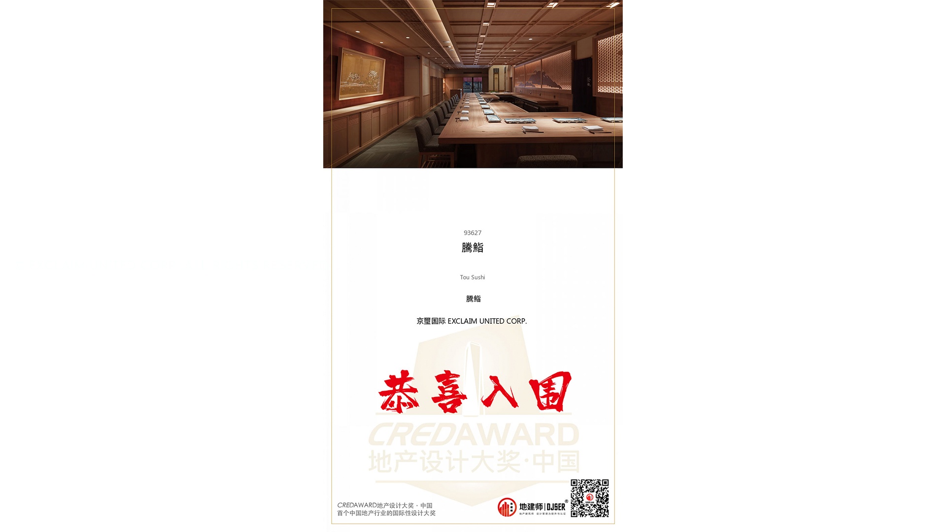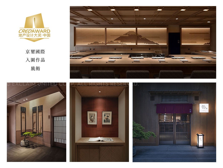 京璽國際 周彥如 设计总监 于作品《腾鮨》 中,运用日本古法工艺,让人彷彿进入时光隧道,回到江户时代,细品美食之馀,更享有细腻典雅的视觉盛宴,其中流露的日式温厚人情,成功获得此届评审一致青睐,让品牌再度享誉国际!