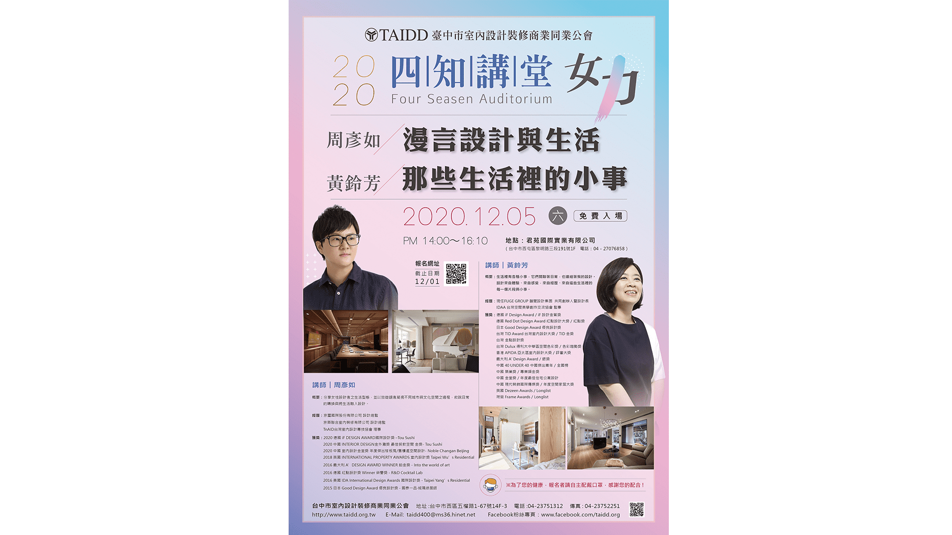 受 台中市室內設計裝修商業同業公會 #TAIDD 邀請,設計總監 #周彥如 將在2020 四知講堂,以女性設計師的角度,分享設計與生活。並以旅遊觀者凝視不同城市與文化空間之過程,敘說日常的轉換與如何將生活融入設計。歡迎大家報名參加! 時間|2020/12/05 14:00-16:10 地點|台中市西屯區黎明路三段191號(君苑國際) 備註|免費入場 (名額有限,額滿為止)