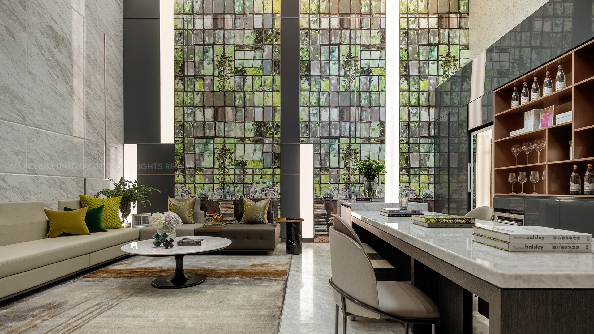 上方自然採光線帶入地下一層室內空間,同時引領刻意放大天光屏幕效果流瀉於立面自然綠意的畫面中,線性的設計語言呼應挑高間的想象力,創造所有生活的可能性也是家人朋友們共同凝聚情感的場景空間。