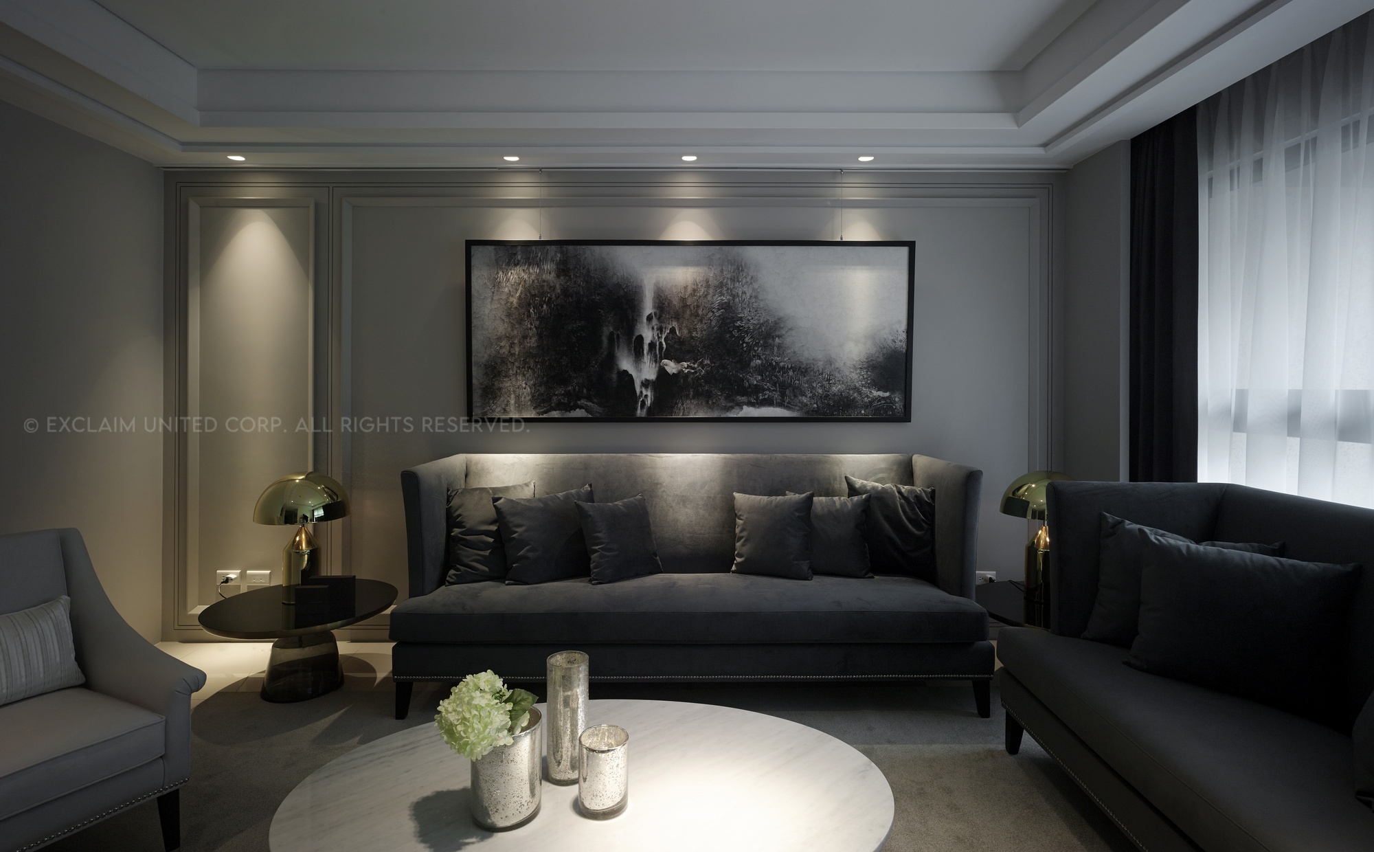 設計師以輕古典姿態,體現層峰人士的生活美學,空間主題圍繞藝術、綠意、生活三大概念,以線條語彙、變化疏密排列與重疊組合,運用光影成就空間,臨摹出立體的立面表情,在獨具匠心的收邊之處,展現桀驁的設計細節。同時重視每個細節處理工法,賦予鋼琴面質感的電視牆面,散發出暖白光澤感,加以溝縫形成線性切割,刻劃出簡約俐落的點線面設計。轉折之間,則以清玻璃做銜接,呈現輕盈透亮的視覺感受,轉進私領域內,則低調奢華俯拾皆是。