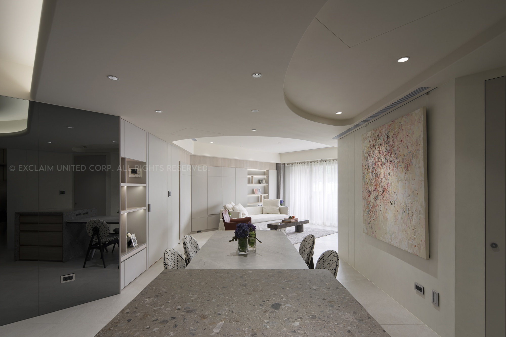 午後陽光自三面採光的窗景灑落,照亮客廳與餐廳,讓空間顯得開放而明亮。朋友來訪時,笑聲與禱告聲在弧形天花的流線下自然迴盪。夜晚燈光轉換成柔和的層次照明,帶出藝品與家具的不同表情,讓場域既安靜又充滿故事感。