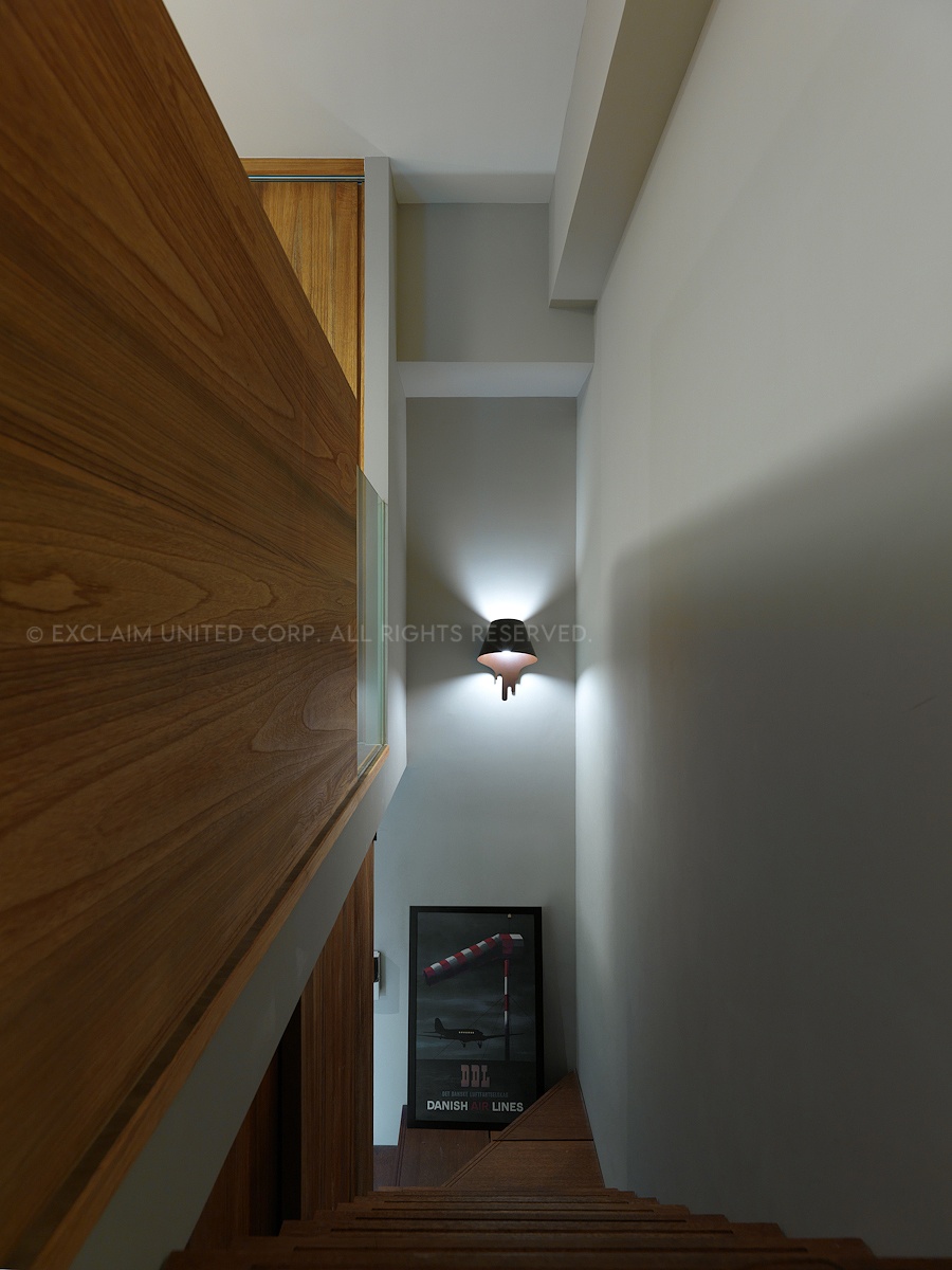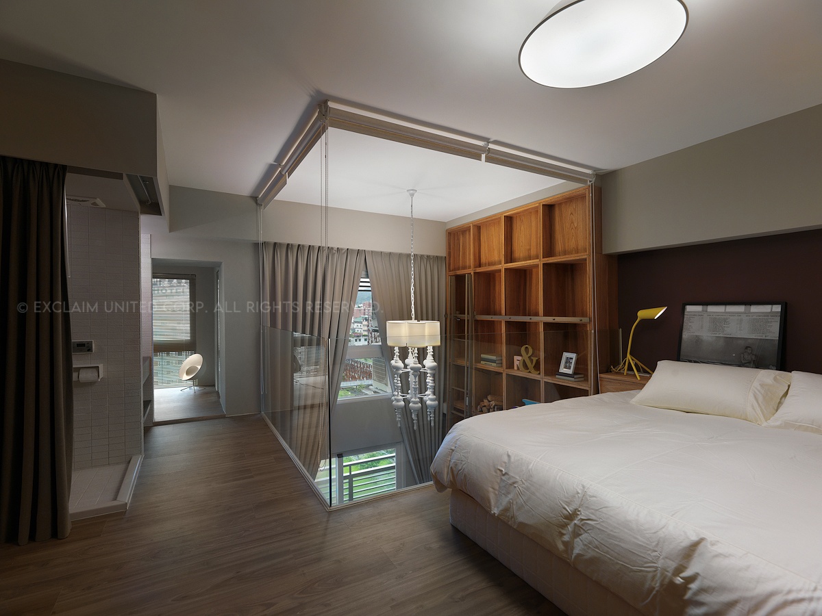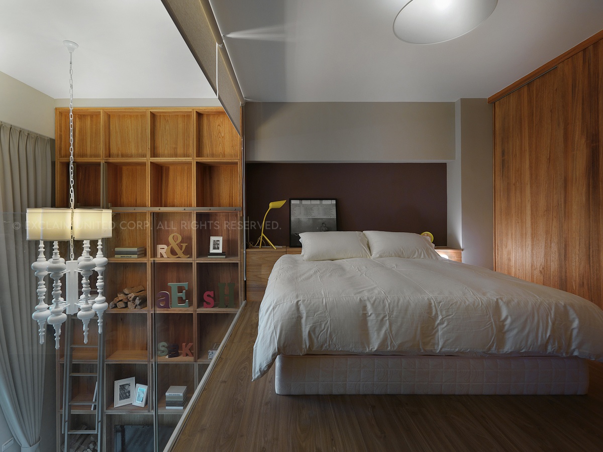 視覺落地原木書櫃,垂直的空間動線分配不同機能需求。